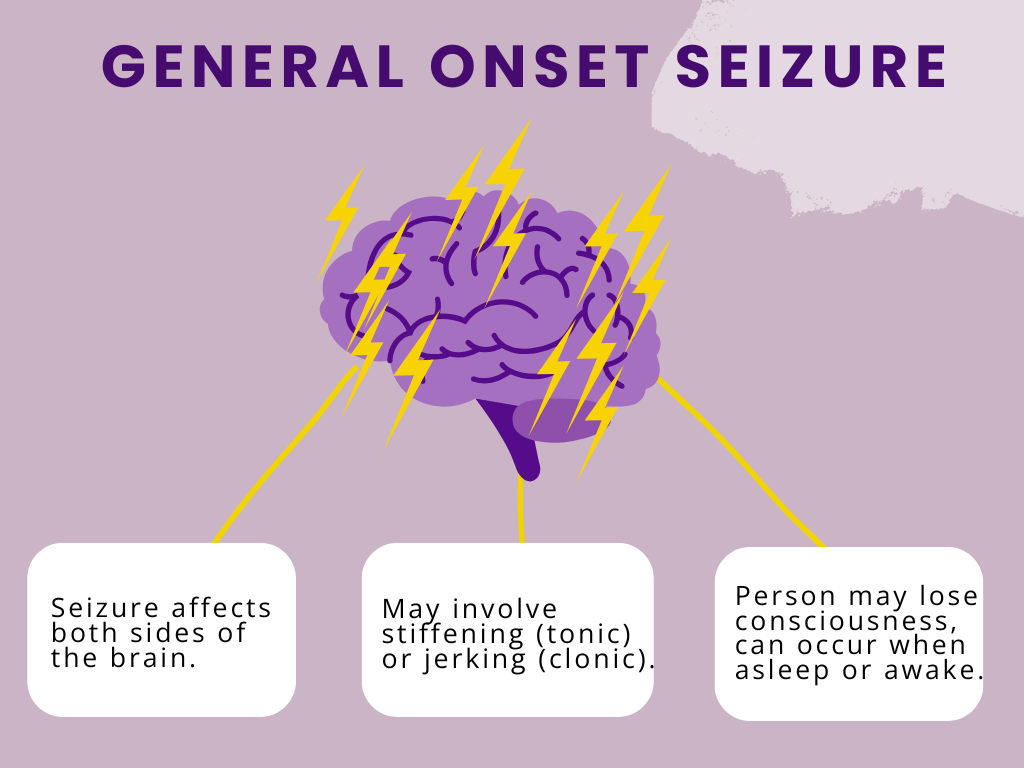 A general onset seizure begins on both sides of the brain at the same time. According to the CDC, they often cause a loss of consciousness or awareness. A person’s muscles may have a combination of stiffening, relaxing, spasming, shaking, or jerking. The older term for these seizures, called “grand mal” is now referred to “tonic-clonic”. Tonic is when muscles become stiff and clonic is a period of rhythmic shaking or jerking movements. A general onset seizure can also cause a person to cry out, lose consciousness and fall down to the ground.